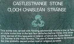 The top half of the stone is covered with a continuous abstract curvilinear La Tène style design similar to that on the Castlestrange Stone in County Roscommon.[1]