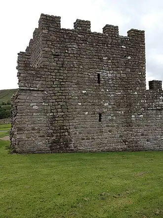 A turret was a small watch tower, incorporated into the curtain wall of Hadrian's Wall. The turrets were normally spaced at intervals of one third of a Roman mile (equivalent to 495 metres (541 yd)) between Milecastles, giving two Turrets between each Milecastle.[1]