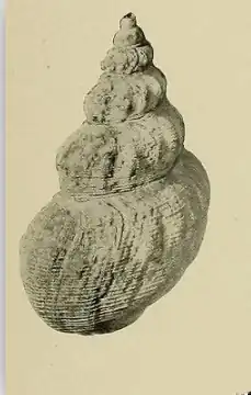 The height of the figured specimen (apex and siphonal canal defective) is 43 mm. The width of the body whorl is 24 mm.