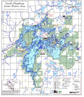 The Turtle-Flambeau Flowage is a 12,942 acres (52.37 km2) lake in Iron County, Wisconsin.[1] It has a maximum depth of 15 meters and is the seventh largest lake in the state of Wisconsin by surface area. The flowage is home to unique wetland patterns and plant species as well as several species of sport and game fish, including musky, panfish, largemouth bass, smallmouth bass, northern pike, walleye and sturgeon. The lake's water clarity is low, but can vary in different locations.[2] Fishing, camping, boating, and hunting are popular activities on the flowage, and Ojibwe people traditionally harvest fish and game on the lake. Environmental concerns on the flowage include mercury contamination, algal blooms, and several types of invasive species.