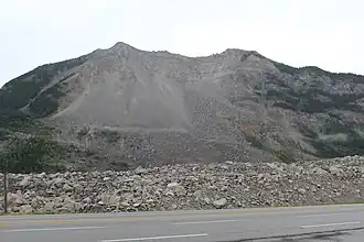 The mountain is most famous for the 1903 Frank Slide in which 30 million cubic metres (82 million tonnes) of limestone broke away from the top of the mountain, burying the East half of the town of Frank and killing about 70 to over 90 of the approximate 600 residents of the town.[3] However, only 12 bodies were ever recovered.[4] The mountain has been monitored since 1903 with the most recent project established in 2003.[5]