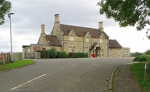 Opened by the Bedford and Northampton Railway on 10 June 1872,[1][2] the station was a mile from the village of Turvey.[3][4] This was a result of the decision to route the line to the south of Turvey in order to avoid Turvey Abbey and the River Great Ouse.[5] The station was therefore sited near the main road away from the village.[5] However, a small hamlet developed around the station, including a public house called The Railway Inn.[6] An attractive stone building was provided with two platforms.[4][7] Two sidings looped from the Up line to reach a small goods yard, while a further siding just to the north served cattle pens.[3] A signal box stood at the Olney end of the Down platform.[8] Five trains each way ran on weekdays and none on Sundays.[9][10]