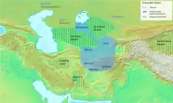 This identification is based on a number of rationals. First, during the time of the Avesta, the region of Turan was inhabited by Iranic steppe nomads. In addition, a number of Turanian personal names, like Frarasyan,[27] Agraeratha,[28] Biderafsh,[29] and Arjataspa,[30] appear in the Avesta. They have been studied by linguists and are all Iranic in character.[31] Furthermore, the story of the mythical king Thraetaona, who divided the world among his three sons Tur (Turya), Sarm (Sairima) and Iraj (Arya), is interpreted as a recognition of an ancient kinship between Turanians and Iranians.[32] Finally, the ethnonym of the Sairimas has been connected to the Sarmatians and Sauromatians.[33] Likewise, the ethnonym Dahi may be related to Dahaes.[34]