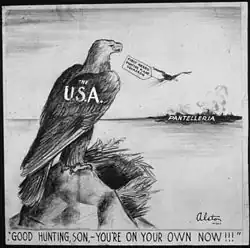 The 99th was finally considered ready for combat duty by April 1943. It shipped out of Tuskegee on 2 April, bound for North Africa, where it joined the 33rd Fighter Group and its commander, Colonel William W. Momyer. Given little guidance from battle-experienced pilots, the 99th's first combat mission was to attack the small strategic volcanic island of Pantelleria, code name Operation Corkscrew, in the Mediterranean Sea to clear the sea lanes for the Allied invasion of Sicily in July 1943. The air assault on the island began 30 May 1943. The 99th flew its first combat mission on 2 June.[39] The surrender of the garrison of 11,121 Italians and 78 Germans[40] due to air attack was the first of its kind.[41]