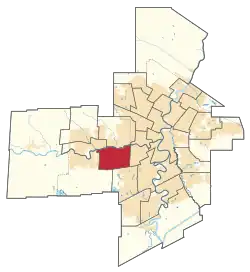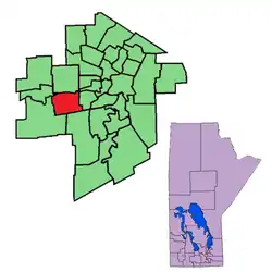 The riding contains the neighbourhoods of Edgeland, J. B. Mitchell, Mathers, Old Tuxedo, Sir John Franklin, South Tuxedo, Tuxedo, Vialoux, as well as Elmhurst and Varsity View east of Laxdal Rd.