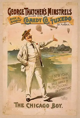 Actor and songwriter Edward Marble wrote and produced Tuxedo for George Thatcher and his minstrel troupe known as Thatcher's Minstrels.[1][2] The show debuted in Lincoln, Nebraska, on July 23, 1891.[3] It then toured, including to Boston, Massachusetts, beginning on August 24, 1891, and the National Theater in Washington, D.C.[4] Tuxedo arrived in New York at the Park Theatre (at Broadway and 35th Street) on October 5, 1891.[5]
