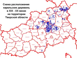 Refugees from the Korelsky uyezd of the Vodskaya pyatina settled on the palace (state) lands of the Upper Bezhetsk and other parts of the Bezhetskaya pyatina, which were deserted due to the turmoil and oppression of the Time of Troubles; historically, these territories made up Tver Karelia. By the beginning of the 20th century, the largest number of Tver Karelians lived in Bezhetsky, Vesyegonsky, Vyshnevolotsky, Novotorzhsky, partly in Tversky, Zubtsovsky, Kashinsky uyezds.[1] According to the 1926 census, the Tver Karelians numbered 140,567 people, of which more than 95% spoke the Karelian language.