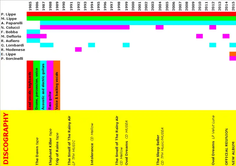 In 1992, following this small and unexpected success, the band was hired by Mellow Records of Sanremo,[3] a label specializing in progressive rock, and later by the French label Musea.[4] In 1994, Mellow published the second album, "Intolerance,"[5] and reprinted The Smell of the Rainy Air on CD.[6] In 1999, Musea published the third album, Oval Dreams, which became their best seller.[7] The band has also participated in some compilations of Progressive Rock and has published, under Creative Commons, a collection of previously unreleased tracks titled Before and After The Boundary.[8] The band's fourth album, The Sleepseller, was published in 2004 in collaboration with Musea who oversaw the distribution. The first track of this album, "Bari Brazil," was recently selected as the soundtrack of the video communications agency Mirror.[9] All works of the band are available for legal download on Bandcamp and can be purchased in CD format by Musea,[10] Mellow[11] and Velut Luna.[12]