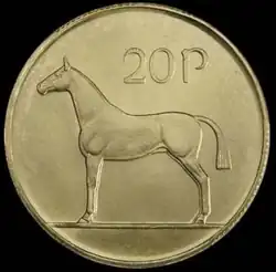 The coin was designed to relieve the expense of creating the lower denominations and to assist the public and traders alike by creating a higher value coin which could assist in the removal of some five- and ten-pence coins. In 1982 the Minister for Finance, Ray MacSharry, announced that an intermediate denomination between the ten- and fifty-pence coins would be introduced.[1] In August 1984 the twenty-pence denomination was chosen over a twenty-five-pence one; the Arts Council of Ireland recommended the horse design.