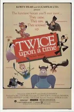 Twice Upon a Time is a 1983 American animated adventure fantasy comedy film co-directed by John Korty and Charles Swenson from a screenplay by Korty, Swenson, Suella Kennedy, and Bill Couturié.[4] The first animated film produced by George Lucas, it uses a form of cutout animation which the filmmakers called "Lumage," involving prefabricated cutout elements that the animators moved on a light table, emulating stained glass.[5]