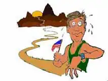 If the course is not different enough, the (dis-)organization of the race deliberately tries to do things differently. The race is held in the evening, rather than the morning. The 4 p.m. start time allows for even the slowest competitors to find their way back to the finish before sunset. The age division are uniquely broken into 6 year age groups, with records carefully kept based on these age groups since the race started.[1] And while the entry fees are kept to a minimum, race management deliberately requests all entrants use day of race registration. A $5 penalty for EARLY registration is charged . . . nobody has ever been interested in paying for such a privilege. While many running races make T-shirt sales an important part of their marketing, flyers for this race advertise T-shirts are available for $30, which somehow has had a severely detrimental effect on their sales. The awards have traditionally been personalized mugs and commemorative tiles with the race logo. The tiles have become so treasured, perhaps a badge of honor, that some competitors have put them on display by installing them in their kitchen or bathroom wall.