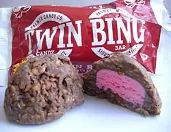 The Twin Bing is a candy bar made by the Palmer Candy Company of Sioux City, Iowa. It consists of two round, chewy, cherry-flavored nougats coated with a mixture of chopped peanuts and chocolate. The company also produces individual Bings, as well as the King Bing, a package of three. The Twin Bing was introduced in the 1960s, possibly in 1969, according to Marty Palmer, the 5th-generation president of the Palmer Candy Company,[1] and has been called "one of Sioux City's quintessential treats".[2]