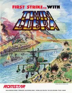 Twin Cobra, known as Kyukyoku Tiger[a] in Japan, is a vertically scrolling shooter developed by Toaplan and released for arcades in 1987 by Taito in Japan and Europe, then in North America by Romstar.[1] It is a sequel to the 1985 arcade game Tiger-Heli.[4] Controlling the titular attack helicopter, the players must fight endless waves of military vehicles while avoiding collision with their projectiles and other obstacles. It was the fourth shoot 'em up game from Toaplan, and their tenth video game overall. It was ported to multiple platforms, with each done by different third-party developers that made several changes or additions.