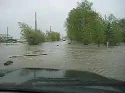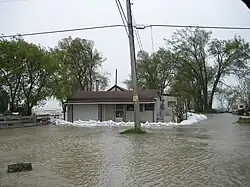 On May 31 [3], strong winds from the northwest which reached at times over 100 km/h occurred on Lake Manitoba, causing waves as high as 7 feet (2.1 m) which resulted in major flooding at Twin Lakes Beach and the surrounding beaches such as Laurentia Beach and Sandpiper Beach, as well as other locations on the lake including Delta Beach and St. Ambroise.[28] The strong wind caused water from the north basin of Lake Manitoba to transfer to the south basin causing lake to surge (seiche effect) from 816.29 feet (248.81 m) above sea level in the morning to an estimated level of 820.37 feet (250.05 m) above sea level, a rise of over 4 feet (1.2 m).[21][29] The result was overland flooding occurring on property and roads as well as damage to residences. Mandatory evacuations were ordered by the Rural Municipalities of Woodlands and St. Laurent to all cottagers and permanent residents on Twin Lakes Beach.[30] Many cottages and homes were damaged and destroyed as a result of the storm. While the community remained under mandatory evacuation orders, structural experts were brought into the Twin Lakes Beach area to inspect every building on each property to assess the structural integrity of them and determine whether or not each building was structurally sound, and whether or not residents would be able to enter their homes and cottages.[31] Buildings were rated on a scale of level of destruction from 1 to 4 with 4 being the worst, meaning that the building cannot be rehabilitated, cannot be entered, and must be demolished.[32]