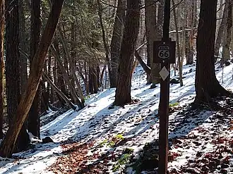 The trail remains on high ground for several miles then descends alongside a small stream until crossing Forest Road 152 at 7.3 miles. The trail reaches Wolf Run again and follows it for another lengthy stretch. At 9.2 miles, cross the incoming Coon Run; that stream and Wolf Run converge to form the south branch of Tionesta Creek. The trail follows this creek for about a mile, including a wide crossing at a spot where an old footbridge failed and was never replaced.[8] The trail, now trending to the northwest, climbs gradually away from the creek, crosses Crane Run, and at 12.9 miles crosses Forest Road 443 east of the small village of Brookston.[9] Now heading north, the trail wraps around the "four corners" point of Elk, Forest, Warren, and McKean Counties, passing through parts of three of those (not including McKean) in less than one mile. The trail passes near Tionesta Wild Area, crosses two branches of Fork Run,[10] and then crosses the border into the southern reaches of Tionesta Scenic Area, ending after 15.8 miles at the North Country Trail.[11]