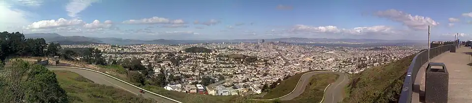 The Twin Peaks are two prominent hills with an elevation of about 925 feet (282 m)[1] located near the geographic center of San Francisco, California. The Twin Peaks are the second and third highest natural points in San Francisco; only 928 foot (283 m) Mount Davidson is higher within city limits.[3]