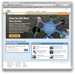 Twine (at Twine.com) was an online social web service for information storage, authoring and discovery that existed from 2007 to 2010. It was created and run by Radar Networks. It was announced on October 19, 2007 and opened to the public on October 21, 2008.[1] On March 11, 2010, Radar Networks was acquired by Evri Inc. along with Twine.com.[2] On May 14, 2010, twine.com was shut down, becoming a redirect to evri.com.