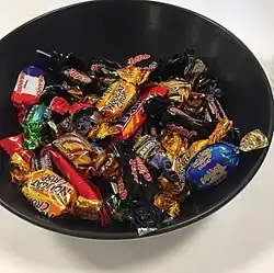 Twist is a bite-sized confectionery produced by Freia[1] (owned by Mondelez), primarily for the Scandinavian market. Twist is sold in bags, and each bag contains a variety of pieces, mostly consisting of chocolates with some sort of filling in the center. New pieces are added and old ones discontinued frequently. Only two pieces, Lakris (licorice) and Cocos (coconut-filled chocolate), have existed since the product was launched. The name Twist refers to the way each piece is wrapped.