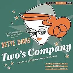 Two's Company is a musical revue with principal sketches by Charles Sherman and Peter DeVries, principal lyrics by Ogden Nash and Sammy Cahn, and principal music by Vernon Duke.