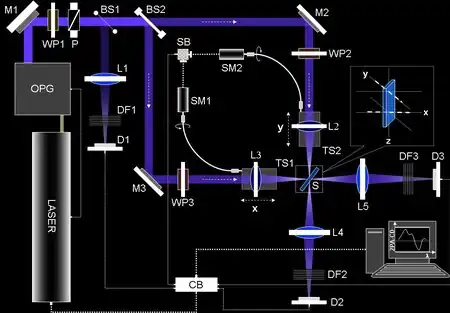 To briefly describe the setup, short pulses coming from the excitation source (typically an OPG or an OPA) are split into “twin” pulses (at BS2), then the polarization of the pulses is controlled individually using quarter-waveplates (WP2 and WP3), allowing to perform simultaneous polarization dependent measurements. The sample is held in a 1 mm quartz cuvette and the incident angle of the light coming from both arms (M2 and M3) is 45°. The two incident beams have a separation on the vertical axis of about 1 cm, to avoid interference effects. Unlike Z-scan, in the double L-scan the sample is at fixed position and two identical focusing lenses (L2 and L3) move along the propagation axis (z axis). Calibration is required to ensure that z1= z2 during the entire scan.