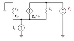 Note: Tabulated formulas in Table 3 make the g-equivalent circuit of the transistor from Figure 8 agree with its small-signal low-frequency hybrid-pi model in Figure 9. Notation: rπ is base resistance of transistor, rO is output resistance, and gm is mutual transconductance. The negative sign for g12 reflects the convention that I1, I2 are positive when directed into the two-port. A non-zero value for g12 means the output current affects the input current, that is, this amplifier is bilateral. If g12 = 0, the amplifier is unilateral.