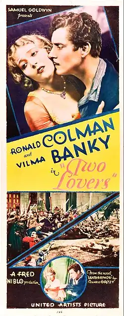 Two Lovers is a 1928 American synchronized sound historical drama film directed by Fred Niblo. While the film has no audible dialog, it was released with a synchronized musical score with sound effects using both the sound-on-disc and sound-on-film process. The film stars Vilma Bánky, Ronald Colman, and Noah Beery. Based on the novel Leatherface: A Tale of Old Flanders by Baroness Emma Orczy, it was produced by Samuel Goldwyn.[1]
