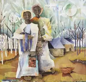 Two Moons is a 2010 mixed media collage by artist India Cruse-Griffin, which depicts a couple holding various objects, standing in front of two houses and several trees, while two moons float in the sky. The work, which measures 24" x 25", framed, is made from collaged paper gathered from magazines, upon which Cruse-Griffin then paints, often allowing the underlying magazine paper to show through.[1][2] While her subjects are often clear and straightforward, this collage technique serves as a reminder of the accumulation of lived experience.[1][2]