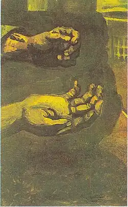 Vincent made many studies of peasants in 1885, culminating in his first major painting, The Potato Eaters.[3] In his works, Van Gogh used particularly somber colors and colors mixed with black, which he felt was like that of 17th-century masters, such as Frans Hals. His brother, Theo van Gogh (art dealer) had asked him often to lighten up his work, referring to the work of the Impressionists. Once Van Gogh went to Paris, he did open up his palette to color and light and admitted that his works from this period were old-fashioned.[14]