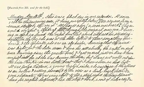 Two Years Before the Mast was "conceived as a protest and written to improve the lot of the common sailor".[7] The literary style provides a concrete description of a seaman's life to serve as a practical guide, and not as an adventure novel.[8] His unpolished, laconic style achieved a literary quality, however, that influenced novelist Herman Melville, according to American essayist Wright Morris.[9] In the following excerpt from Dana's diary, the entry expresses not only chronological information, but how a seaman "apprehends time".[10]