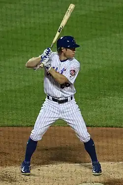 On November 13, 2015, Kelly signed a minor league contract with the New York Mets that included an invitation to spring training.[25] The Mets promoted Kelly to the major leagues on May 23, 2016, in his eighth pro season (after 855 minor league games, and 3,063 minor league at bats), to replace an injured Lucas Duda.[26][27][10] At the time, he was leading the minor leagues with a .391 batting average and a .478 on base percentage.[10]