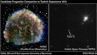 The supernova SN 1572 is often called "Tycho's supernova", named after Tycho Brahe who observed the "new star" in 1572. The postfix "G" originates from the candidate companion stars considered in a 2004 study, labelled Tycho A to Tycho V.[4]