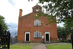 Under the terms of the Poor Law Amendment Act 1834 the townships formed part of the Leigh Poor Law Union comprising an area covering the whole of the ancient parish of Leigh and part of Winwick, established on 26 January 1837. A workhouse in Tyldesley was replaced by Leigh Union workhouse at Atherleigh in the 1850s.[52] Tyldesley was constituted a civil parish in 1866.[53] In 1863 the Local Government Act 1858 was adopted and the township was governed by a local board of health. The first Tyldesley Local Board was formed after elections on 24 October 1863. Among those elected were mill owners, Caleb Wright and Oliver Burton (son of James Burton), and colliery owners, William Ramsden and George Green, a mixture of Tories and Liberals.[54] The Local Board took over the gas works in 1865, built the first swimming baths and opened Tyldesley Cemetery in 1876 and built sewage works at Morleys Hall in Astley in 1884. The local board offices were in Lower Elliot Street, where it had a fire station and depot.[55] Under the Public Health Act 1875 the local board gained additional powers as an urban sanitary district and under the Local Government Act 1894 Tyldesley-with-Shakerley became an urban district with an elected council. Tyldesley Town Hall, originally the township's Liberal Club, opened in 1881, and was taken over by Tyldesley Urban District Council as its headquarters in 1924.[56] Tyldesley UDC opened Tyldesley Park in 1902, the Carnegie Library officially opened in 1909, and after World War I council housing was built at Sale Lane and Mosley Common and after World War II in Shakerley.[57]