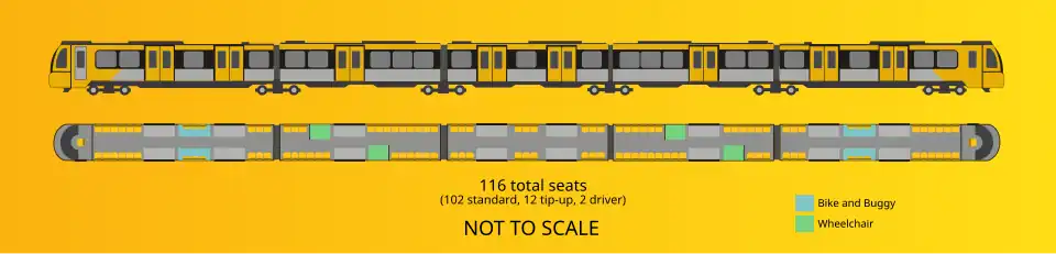The trains will feature specially designed retractable steps at the doors, which are designed to bridge the gap between the train and the platform. They will have an overall capacity of 600 persons, with 104 seats,[11] specially designed easy access areas and have CCTV, a new passenger information system, USB charging points and air conditioning throughout the saloon.