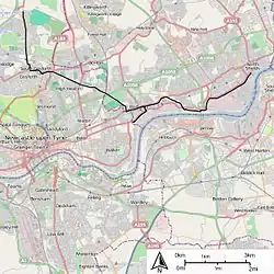 At the eastern end, it connected with the Tynemouth and District Electric Traction Company.[5] However, the Tynemouth company tracks were of a different gauge, so through running was impossible. There was a short section of dual gauge track where the systems met, to allow cars from the different systems to meet for a convenient interchange of passengers.
