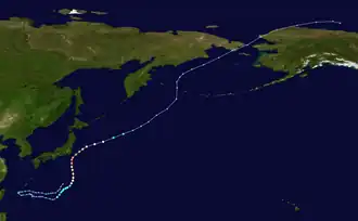 Ampil degraded due to internal fluctuations and a symmetric central dense overcast, while convection was confined to the southern semicircle.[19] Satellite imagery depicted a well-defined 17 km (10 mi) wide eye surrounded by deep convection,[20] though the banding diminished after encountering cold, dry air.[21] Ampil was beginning to undergo an extratropical transition, as its convective structures had dissipated by August 17.[22] The JTWC then ceased issuing advisories on the system the next day as it turned east-northeastward and merged with the mid-latitude westerlies.[23] The JMA reported that Ampil had transitioned into an extratropical low on August 19.[24] The extratropical storm entered the Bering Sea on August 20, crossed the Aleutian Islands, moved inland over the Russian Far East and Arctic Alaska, emerged into the Arctic Ocean between August 21–22, and dissipated on August 23.[25]