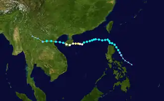 Damrey made landfall at Wanning, China's Hainan, at 20:00 UTC on September 25 (04:00 on September 26, local time). It had maximum sustained winds up to 180 km/h. This made Damrey the strongest typhoon to strike Hainan since Typhoon Marge in September 1973. At least 16 people are believed to have died in China,[1] and the entire province of Hainan suffered power outages. Damrey went on to impact Vietnam before losing tropical characteristics. The JTWC ceased advisories on September 27, with the final one taking place at 09:00 UTC, once the system was 90 nautical miles (170 km) south-southwest of Hanoi, Vietnam.