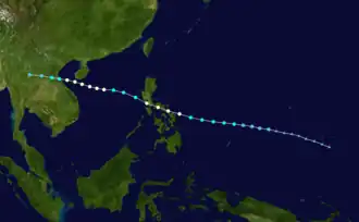 Typhoon Dan, known in the Philippines as Typhoon Saling, was the third of a series of tropical cyclones that impacted the Philippines and Vietnam in October 1989. The storm developed on October 6, and tracked generally westward throughout its course. After crossing Luzon, the typhoon emerged into the South China Sea and reached its peak intensity, with sustained 10-minute winds of 140 km/h (85 mph), 1-minute winds of 130 km/h (80 mph), and a minimum barometric pressure of 960 millibars. The storm moved ashore in central Vietnam and dissipated after moving inland. The storm caused extensive damage throughout its course. In the Philippines, Dan left hundreds of thousands homeless and killed 58 people. Power outages were extensive in the Manila region. In Vietnam, the storm's high winds and heavy rains caused extensive damage and loss of life. More than 500,000 structures were damaged or destroyed and at least 43 people were killed across the country.
