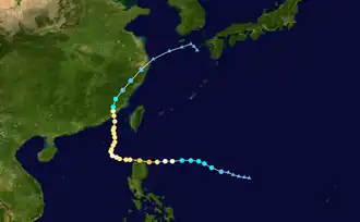 An area of low pressure, would be upgraded to a tropical depression, designated as 26W, developed over the Philippine Sea on October 1 about 750 km (470 mi) to the east of Luzon.[1] The PAGASA designated the system Pepang.[2] The system intensified as it moved west-northwest, making the system gain the name Dan on October 3. Dan would strengthen to a typhoon status the next day. Typhoon Dan reached its peak with winds of 205 kilometres per hour (125 mph) early on October 5 and hit northern Luzon at that strength. The typhoon weakened as it entered the South China Sea, but re-intensified as it turned towards the north. Typhoon Dan made its second landfall near Xiamen, China on October 9 and weakened overland. Dan turned to the northeast and weakened to a tropical depression before it moved over the Yellow Sea late on October 10, later getting absorbed by a frontal system over the Yellow Sea early the next day.[1]
