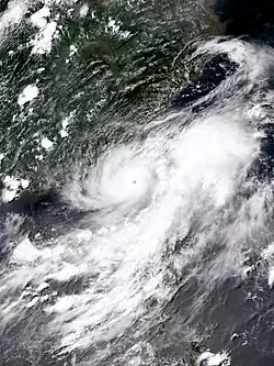 Danas made landfall at peak intensity near Budai, Chiayi County, Taiwan at 23:40 TST (15:40 UTC) on July 6, with 10-minute maximum sustained winds of 120 km/h (75 mph), becoming the first typhoon to strike the island's central western coast since Typhoon Wayne in 1986.[12] It was also the first storm on record to make landfall in Chiayi County at typhoon strength.[13]