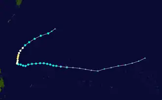 The JTWC upgraded the depression to a Tropical Storm late the next day and then early on December 12 the JMA designated the depression as a full tropical depression.[8][9] The Tropical Depression was then upgraded to a Tropical Storm and named Dolphin later that morning as it moved westwards towards the Philippine Atmospheric, Geophysical and Astronomical Services Administration (PAGASA) area of responsibility.[10][11] The next day as Tropical Storm Dolphin moved into PAGASA's area of responsibility, PAGASA assigned the local name of Ulysses to Dolphin.[12] The JMA upgraded Tropical Storm Dolphin to a Severe Tropical Storm late on December 14.[13] Whilst Dolphin was upgraded to a Typhoon by the JTWC early the next day as Dolphin recurved towards the North.[14] Later that day the JTWC reported that Typhoon Dolphin had reached its peak winds of 90 kts (105 mph; 165 km/h 1-minute winds) which made Typhoon Dolphin a category two Typhoon on the Saffir–Simpson hurricane scale.[15] At the same time the JMA reported that Severe Tropical Storm Dolphin had intensified into a Typhoon and had also reached its peak wind speeds of 65 kts (75 mph; 120 km/h 10-minute winds).[16]