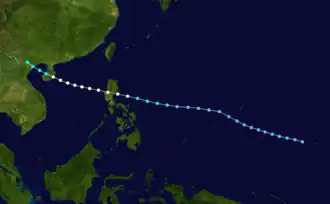 The intensification trend persisted as the storm tracked more westward;[5] the JMA declared Eli a severe tropical storm at 06:00 UTC the same day.[3] Twelve hours later, the JTWC estimated at Eli attained typhoon intensity.[6] At 00:00 UTC on July 11, the JMA upgraded Eli into a typhoon,[3] with the JTWC and JMA also analyzing a peak intensity of 135 and 130 km/h (85 and 80 mph) respectively at the same time.[6] Shortly thereafter, the typhoon made landfall on northern Luzon. After entering the South China Sea,[2] the typhoon tracked west[5] as its forward motion slowed in response to Eli nearing the western end of a subtropical ridge.[2] Now tracking west-northwest,[5] data from the JTWC suggested that Eli maintained minimal typhoon intensity until it moved through Hainan on the night of July 13,[2] though data from the JMA indicated that Eli was a weakening tropical storm during this time.[3] The JTWC downgraded Eli into a tropical storm while the system moved west-northwestward across the Gulf of Tonkin.[2] Eli made landfall late on July 13 about 160 km (100 mi) east of Hanoi,[5] with the JMA estimating winds of 80 km/h (50 mph).[3] Eli dissipated over northern Vietnam on July 14.[2]