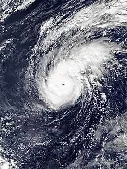 As the system continued tracking westward under favorable conditions in the Pacific Ocean, the JMA and JTWC upgraded the system into a tropical storm, with the JMA assigning the name Goni to the intensifying system.[10][11][12] The PAGASA followed with an upgrade to a severe tropical storm a few hours later.[13] Due to the warm waters surrounding the storm, the system underwent rapid intensification and became a typhoon on October 29.[14][15] On October 29, at 09:30 UTC, Goni entered the PAR and was named Rolly by the PAGASA.[16] Early on the following day, the system was declared a super typhoon by the JTWC a few hours later, the second super typhoon of the season, before further intensifying into the only Category 5-equivalent super typhoon of the season by 06:00 UTC on October 30.[17] After undergoing a brief eyewall replacement cycle on October 31, which is a typical process for a storm of such high intensity,[18] it resumed intensifying, with the JTWC, JMA, and Satellite Analysis Branch[19] all assessing Dvorak technique T-numbers of 8.0, the highest on the scale. On this basis, the JTWC estimated 1-minute sustained winds of 315 km/h (195 mph), tying with Haiyan in 2013, Meranti in 2016 and Surigae in 2021 as the highest reliably estimated in the Eastern Hemisphere. Meanwhile, the JMA estimated a central barometric pressure of 905 hPa (mbar; 26.72 inHg) for the storm,[20][21][22] while the JTWC estimated a minimum central pressure of 884 hPa (mbar; 26.1 inHg).[22]