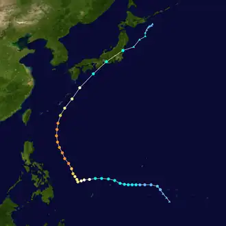Typhoon Guchol, known in the Philippines as Super Typhoon Butchoy, was a powerful tropical cyclone which became the first typhoon to make landfall in Japan on June since 2004.[1] The storm formed as tropical disturbance south-southeast of Pohnpei on June 7, and was upgraded to a tropical depression on June 10. The system later intensified in favorable conditions, and reached typhoon intensity on June 15. It reached peak intensity late on June 17, before making landfall over Japan as a typhoon on June 19. The system became extratropical shortly after traversing Japan and was last noted by the Japan Meteorological Agency on June 22.