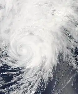By 03:00 UTC the next day, the JTWC reported that the tropical depression had intensified into a tropical storm, as improved convective banding began wrapping into its center.[10] The JMA upgraded the storm three hours later, naming it as Guchol.[11] Over the next few days, Guchol slowly intensified, as convection continued to wrap into the system.[12] By 00:00 UTC on June 14, the JMA upgraded Guchol to a severe tropical storm.[13] It subsequently entered the Philippine Area of Responsibility, with the PAGASA naming it locally as Butchoy.[14] At 15:00 UTC, the JTWC upgraded the system to a Category 1-equivalent typhoon on the Saffir-Simpson scale, as it built a central dense overcast.[15] By the next day, it further strengthened to a Category 2-equivalent typhoon, as an outflow channel became apparent while it took a north-northwestward turn around the western periphery of the subtropical ridge.[16][2] At 21:00 UTC that same day, the JTWC upgraded Guchol to a Category 3-equivalent typhoon.[17] The JMA upgraded Guchol to a typhoon three hours later, on June 16.[18] Nine hours later, Guchol strengthened into a Category 4-equivalent typhoon, as a 18 nmi (33 km) symmetric eye formed.[19] Guchol ultimately reached its peak intensity at 18:00 UTC that same day, with 10-minute sustained winds of 100 knots (185 km/h; 115 mph) and a central pressure of 930 hectopascals (27 inHg), according to the JMA.[20] The JTWC estimated Guchol to have 1-minute sustained winds of 130 knots (240 km/h; 150 mph), although it noted that the system's eye had become less symmetric.[21]