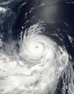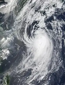 While moving toward Guam, Halong became better organized, developing an eye and well-defined rainbands. After a brief turn more toward the west, the storm passed about 140 km (87 mi) south of the southern tip of Guam at 0200 UTC on July 10; at the time, the JTWC estimated 1‑minute sustained winds of 165 km/h (103 mph),[1] although the JMA had maintained Halong as a tropical storm until upgrading to a typhoon at 1800 UTC that day.[3] An approaching trough increased shear over Halong, and a weak ridge to the north restricted outflow; this briefly prevented significant intensification after the convection decreased. Late on July 11, the thunderstorms increased, and restrengthening resumed.[1] Late on July 12, the JMA assessed Halong as reaching peak 10‑minute sustained winds of 155 km/h (96 mph).[3] Around that time, the typhoon entered the area of the Philippine Atmospheric, Geophysical and Astronomical Services Administration (PAGASA), which gave it the local name Typhoon Inday.[5] Early on July 13, the JTWC upgraded Halong to a super typhoon after the storm developed a well-defined eye 63 km (39 mi) in diameter. Shortly thereafter, the agency estimated peak 1‑minute sustained winds of 250 km/h (160 mph).[1]