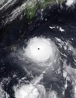 ![]() Hinnamnor at its peak intensity while approaching Okinawa on August 30. | |