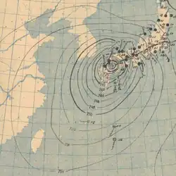 Typhoon Ida, known in Japan as Makurazaki Typhoon (枕崎台風),[1][2] was a powerful and very deadly typhoon that formed over the western Pacific Ocean and struck Japan in September 1945, shortly after the Japanese surrender in World War II, causing over 2,000 deaths. The storm struck parts of Kyushu and Ryukyu which had already been ravaged by the war and compounded the effects of the atomic bombing of Hiroshima, which had occurred only one month prior, resulting in further devastation to the already destroyed city. The typhoon likely had much higher wind speeds than were recorded at the time, with current estimates of the storm's minimum pressure as low as 917 millibars, though meteorologists are uncertain of the storm's true intensity. The typhoon remains one of the deadliest in Japanese history and is one of only a few storms to be known by a separate name in Japanese.