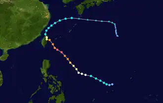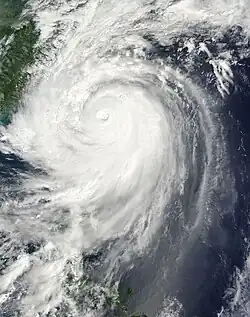Typhoon Jangmi (pronounced [tɕaŋ.mi]), known in the Philippines as Super Typhoon Ofel, was the most intense tropical cyclone in the Northwest Pacific Ocean during the 2000s, tied with Nida in 2009, and the most intense tropical cyclone worldwide in 2008.[1] Jangmi, which means rose in Korean, formed in a low pressure area south of Guam on September 22. After undergoing serious consolidating with convective banding, the low pressure area was upgraded to a Joint Typhoon Warning Center late the same data. Undergoing the same process, the storm developed into a tropical storm on September 24. Undergoing rapid deepening on September 26–27, the storm, now a Super Typhoon entered the Philippine Area of Responsibility, and was named Ofel. The next day, Jangmi made impact in Taiwan, thousands were evacuated, rainfall, up to 994mm were recorded, and thousands of acres of farmland were destroyed. Jangmi was significantly weakened as it interacted with Taiwan, as being downgraded to tropical storm status after leaving Taiwan on September 29. After undergoing an extratropical transition, Jangmi became a remnant low on October 1. After slowly moving eastward, until finally dissipating near Iwo Jima on October 5.