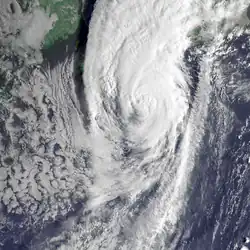 Since September 30, Jelawat was fully embedded in baroclinic zone and began extratropical transition, as the convective banding was unraveling.[22] At 06Z, JTWC downgraded Jelawat to a tropical storm, for deep convection was sheared to the north.[23] The system made landfall over Aichi Prefecture in Japan at 10Z, when the estimated 10-minute maximum sustained winds were at 70 knots (130 km/h, 80 mph). Eight hours later, JMA downgraded Jelawat to a severe tropical storm when it was located in Iwate Prefecture, and JTWC issued the final warning on the system simultaneously.[24] On October 1, JMA downgraded Jelawat to a tropical storm, shortly before becoming extratropical east of Kuril Islands. The extratropical cyclone strengthened and regained storm-force status on October 2, before the system crossed the International Date Line and began to weakened on October 3.[25][26]