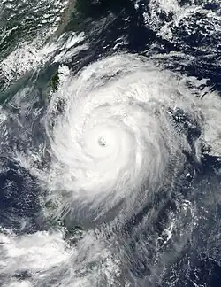With a shrunken 7-nautical-mile (13 km; 8.1 mi) pinhole eye, Typhoon Jelawat passed through the west coast of Okinawa Island early on September 29, when the estimated 10-minute maximum sustained winds were at 90 knots (165 km/h, 105 mph).[19] Equatorward outflow has significantly hindered, as Jelawat started to gradually weaken; however, poleward outflow remained well-established and was linked to a deep mid-latitude trough directly to the north of the system.[20] Then, the typhoon accelerated northeastwards and moved into an area of strong southwesterly vertical wind shear, but jet-induced poleward outflow kept the system from rapid decaying.[21]
